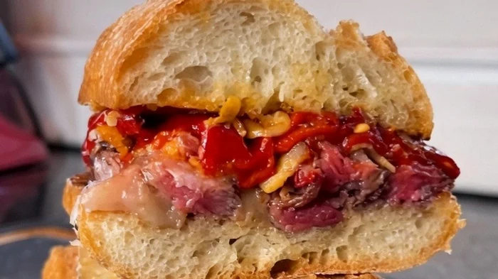 - Se întinde entrecote, se adaugă ardei piquillo, puțin usturoi și un strop de ulei de măsline. Rezultatul este un sandwich cu o crustă crocantă, o textură fragedă în interior și o aromă bogată.